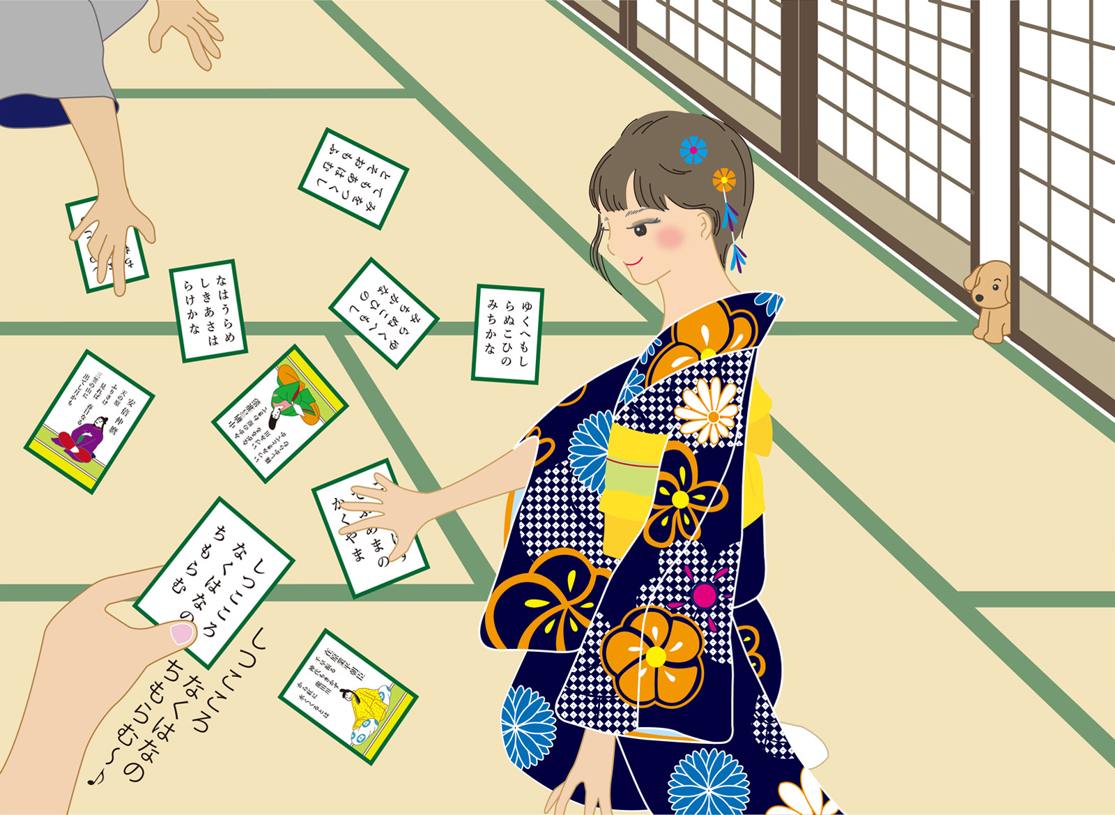 競技かるたの読み札には上の句と歌人のイラストが描かれており、選手は下の句のみが書かれた字札を取り合います。